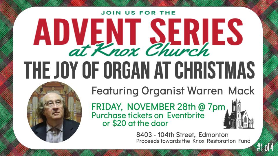 Our Advent series opens with Warren Mack on our Pipe organ. Warren will not only enthrall you with his sacred, seasonal music, but will also provide background information on his pieces. Enjoy the sounds of