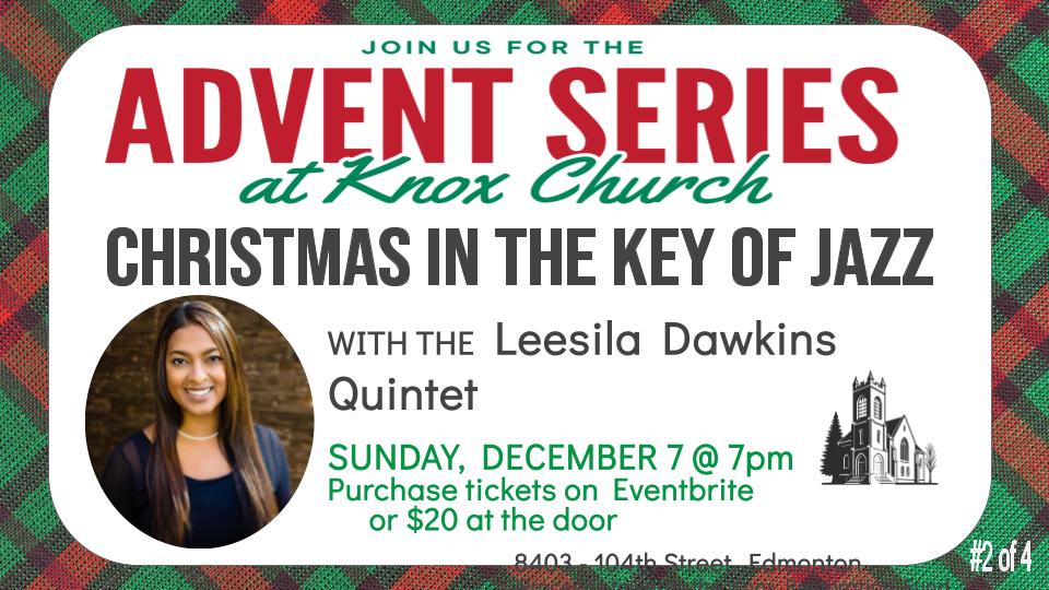 This is our second concert in the 2025 KNOX CHURCH ADVENT SERIES. Tickets may be purchased on Eventbrite or at the door. Join us to hear the Leesila Dawkins' Quintet. You may have heard the